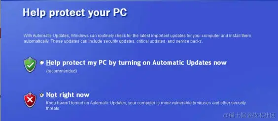 安装过程完成后,系统将提示你使用自动更新保护您的电脑。 默认选择是启用自动更新。 但是,由于我们希望增加我们可用的测试机会,我们将选择Not right now 选项。