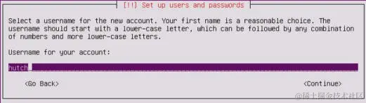 有多个选项可用于定义键盘布局。 一个选项是检测,其中系统会提示你按一系列键,这会让 Ubuntu 检测你正在使用的键盘布局。 你可以通过单击Yes使用键盘检测。 或者,你可以通过单击No手动选择键盘布局。此过程将根据你的国家/地区和语言,默认为你做出最可能的选择。 定义键盘布局后,系统会请求你输入系统的主机名。 如果你要将系统加入域,请确保主机名是唯一的。 接下来,系统会要求你输入新用户和用户名的全名。 与用户的全名不同,用户名应由单个小写字母字符串组成。 数字也可以包含在用户名中,但它们不能是第一个字符。 看看下面的截图: