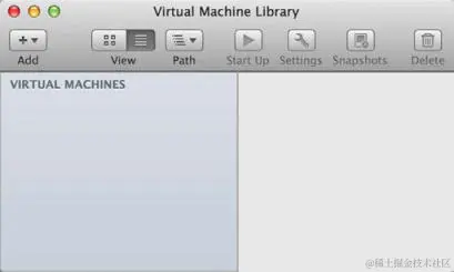 下载软件包后,你应该在默认下载目录中找到它。 运行.dmg安装文件,然后按照屏幕上的说明进行安装。 安装完成后,你可以从 Dock 或 Dock 中的 Applications 目录启动 VMware Fusion。 加载后,你将看到虚拟机库。 此库不包含任何虚拟机,但你在屏幕左侧创建它们时会填充它们。 以下屏幕截图显示了虚拟机库: