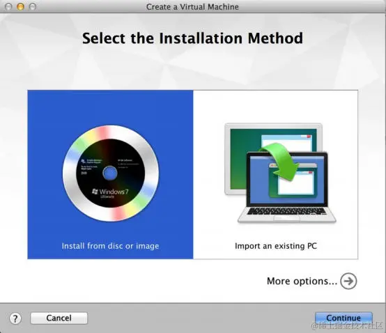 第一步请求你选择安装方法。 VMware Fusion 提供了从磁盘或映像(ISO 文件)安装的选项,也提供了多种技术将现有系统迁移到新虚拟机。 对于本节中讨论的所有虚拟机,你需要选择第一个选项。