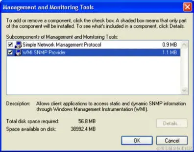 打开后,请确保选中 SNMP 和 WMI SNMP Provider 的复选框。 这将允许在系统上执行远程 SNMP 查询。 单击确定后,会开始安装这些服务。 这些服务的安装需要 Windows XP 映像光盘,VMware 可能在虚拟机映像后删除。 如果是这种情况,你会收到一个弹出请求让你插入光盘,如以下屏幕截图所示: