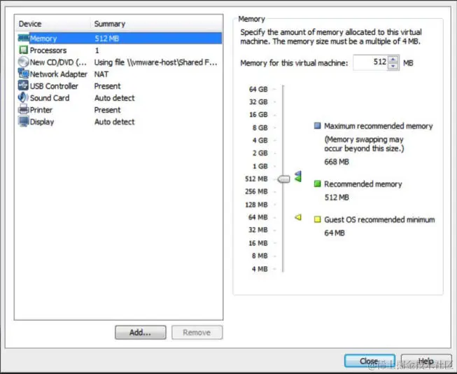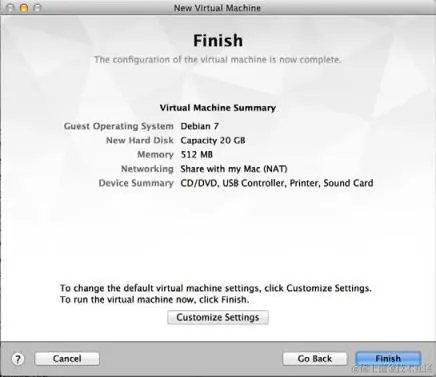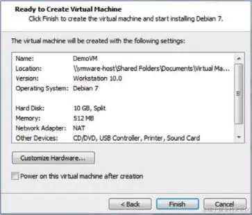 最后一步提供了配置的摘要。 你可以选择Finish 按钮来完成虚拟机的创建,也可以选择Customize Hardware…按钮来操作更高级的配置。 看一看高级配置的以下屏幕截图: