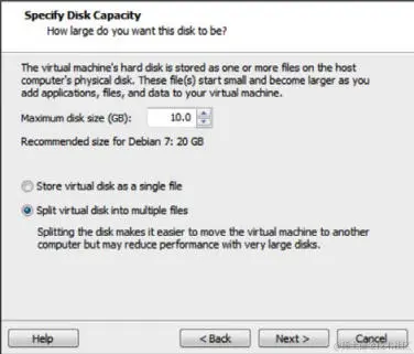 下一个屏幕请求安装的最大尺寸值。 虚拟机会按需使用硬盘驱动器空间,但不会超过此处指定的值。 此外,你还可以定义虚拟机是包含在单个文件中还是分布在多个文件中。 完成指定磁盘容量后,你将看到以下屏幕截图:
