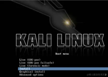 从 Kali Linux 映像文件启动后,你会看到初始启动菜单。 在这里,向下滚动到第四个选项,Install,然后按Enter键开始安装过程: