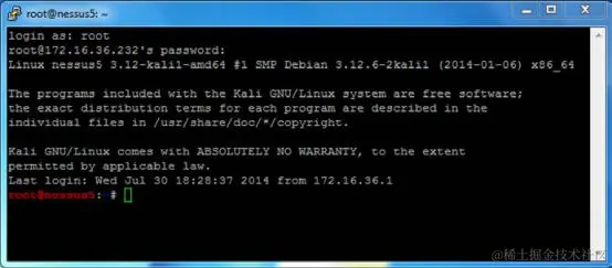 如果你使用 Mac OSX 或 Linux 作为主机系统,则可以直接从终端调用客户端。 或者,如果你在 Windows 主机上运行虚拟机,则需要使用终端模拟器,如 PuTTY。 在以下示例中,我们通过提供 Kali 虚拟机的 IP 地址建立 SSH 会话: