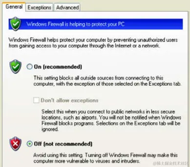 一旦检测到光盘,SNMP 服务的安装会自动完成。 Windows Components Wizard (Windows 组件向导)应在安装完成时通知你。 除了添加服务之外,还应删除操作系统中包含的一些默认服务。 为此,请再次打开Control Panel (控制面板),然后双击 Security Center(安全中心)图标。 滚动到页面底部,单击Windows Firewall(Windows 防火墙)的链接,并确保此功能已关闭,如以下屏幕截图所示:
