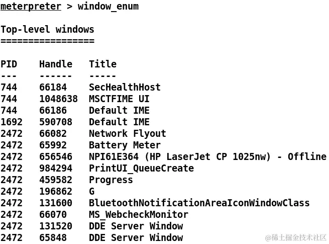 扩展 API 中的window_enum功能为我们提供了受损机器上所有打开的 Windows 的列表。这可能使我们能够更多地了解目标和正在运行的应用程序。让我们看看在目标系统上运行此模块时会发生什么: