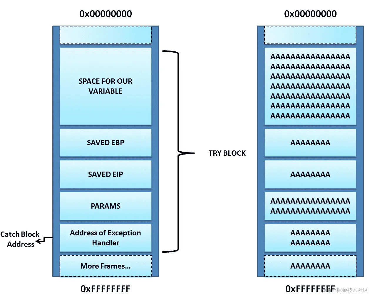 缓冲区溢出漏洞是一种异常情况,当向缓冲区写入数据时,它超出了缓冲区的大小并覆盖了内存地址。以下图表显示了缓冲区溢出的一个基本示例: