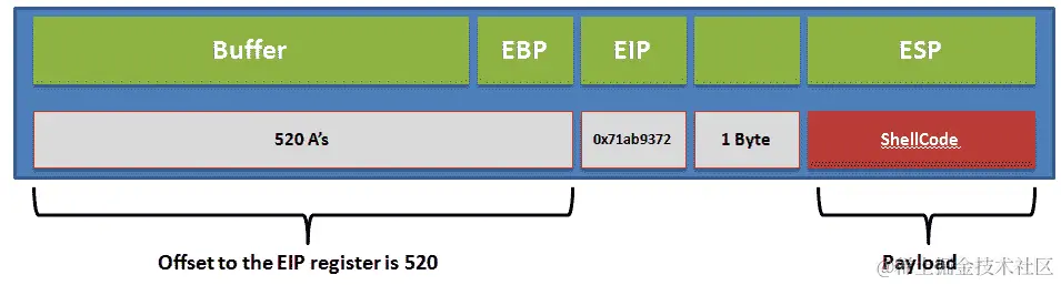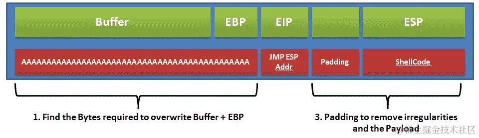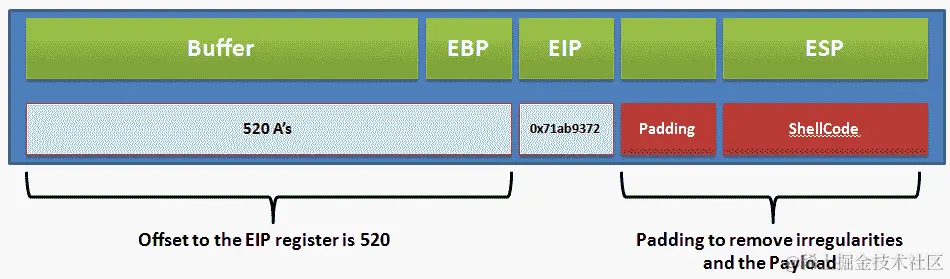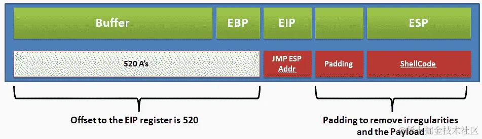 那么,我们如何利用缓冲区溢出漏洞呢?答案很简单。如果我们知道将覆盖 EIP(指令指针)开始之前的一切的确切数据量,我们可以将任何内容放入 EIP 并控制下一条指令的地址。