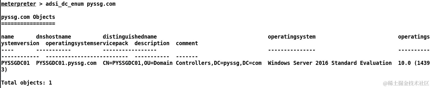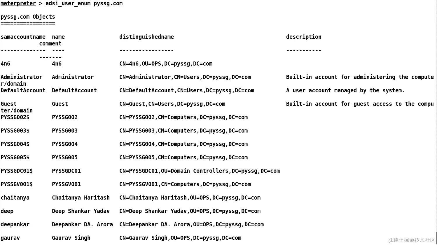 我们还可以使用adsi_dc_enum命令找到域控制器,后面跟着pyssg.com,这是前面截图中显示的域名。我们还可以通过使用adsi_user_enum命令更好地查看 AD 用户,如下面的截图所示: