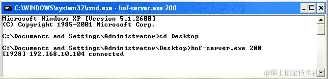 我们可以看到这是一个小型示例应用程序,它监听 TCP 端口200。我们将通过 Telnet 连接到该应用程序的端口200并向其提供随机数据,如下面的屏幕截图所示:
