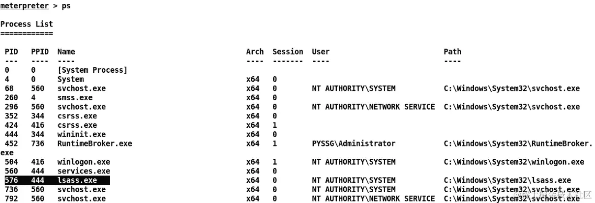 让我们迁移到运行在进程 ID576下的lsass.exe进程,如下所示: