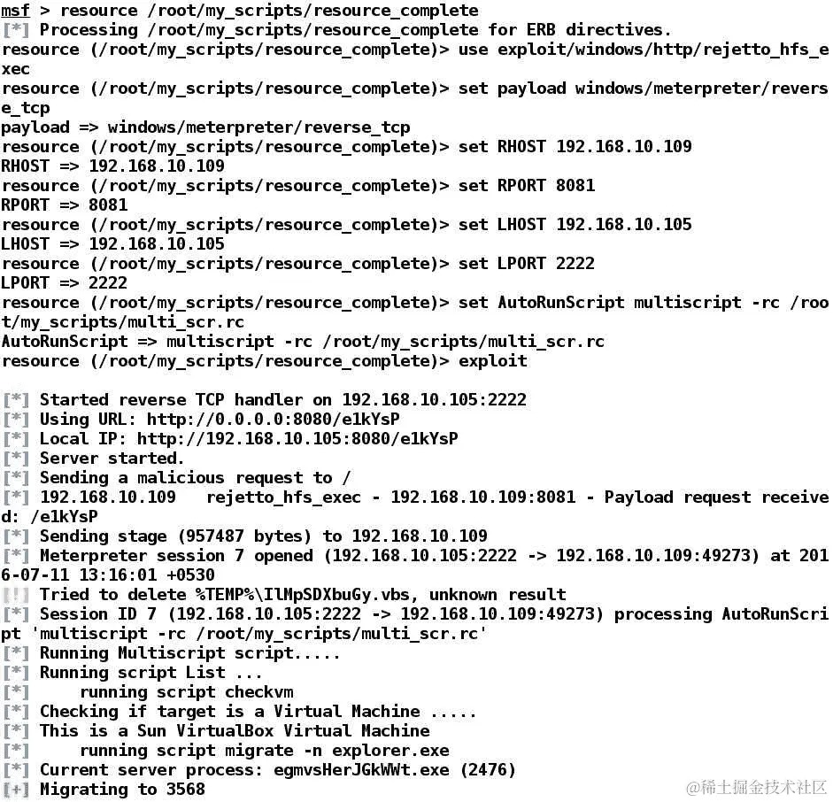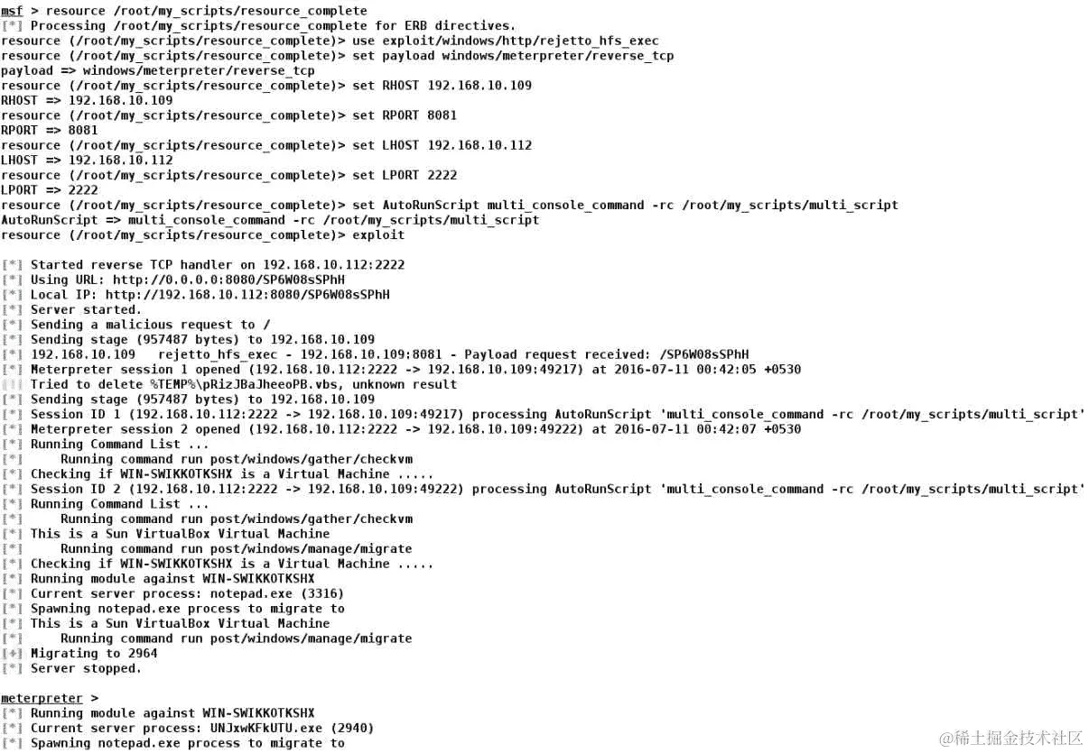 这是一个小的后渗透脚本,自动化了checkvm(用于检查目标是否在虚拟环境中运行的模块)和migrate(帮助从被利用的进程迁移到更安全进程的模块)。让我们看一下下面的利用脚本: