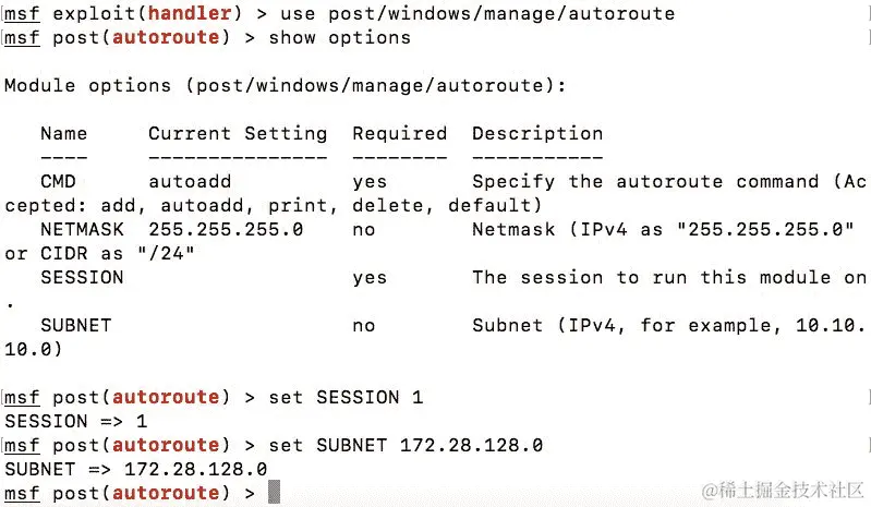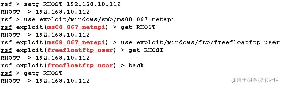 在前面的截图中,我们使用setg命令分配了RHOST。我们可以看到,无论我们多少次更改模块,RHOST的值对于所有模块都保持不变,我们不需要在每个模块中手动输入它。get 命令从当前上下文中获取变量的值,而getg命令从全局变量中获取值,如前面的截图所示。