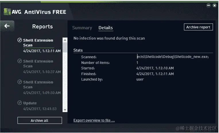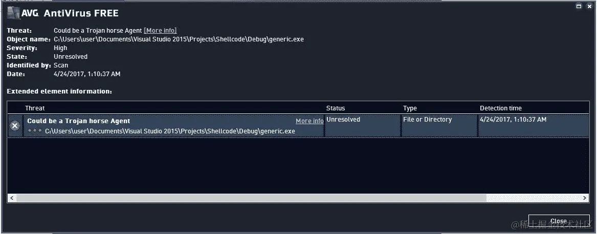 我们生成的文件引起了 AVG 防病毒软件的突然警报并被检测到。让我们在 majyx 扫描仪上扫描我们的generic.exe文件,以获取检测率的概述,如下所示: