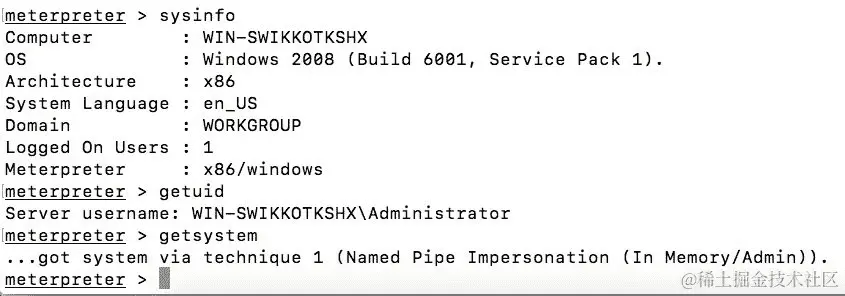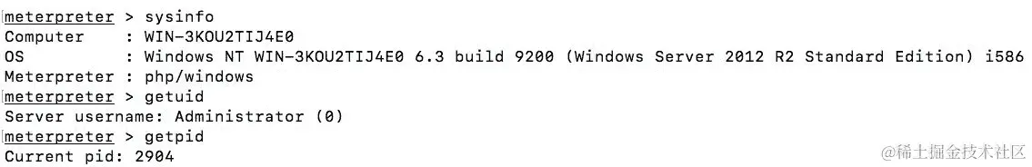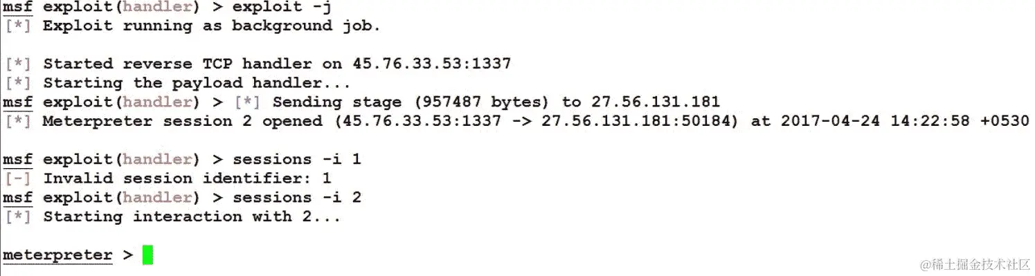 哦,好!这里也没有检测到。让我们看看我们是否已经获得了对目标的 meterpreter 访问: