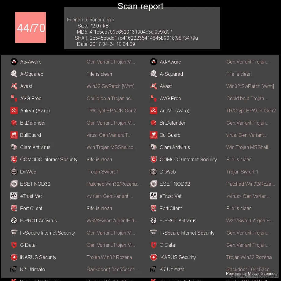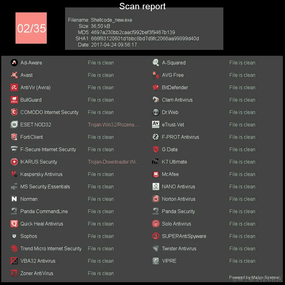 majyx 扫描仪有 35 个 AV,但有时会对每个 AV 进行两次扫描,因此会有 70 个 AV 条目。请将前面的扫描结果视为 22/35,而不是 44/70。
