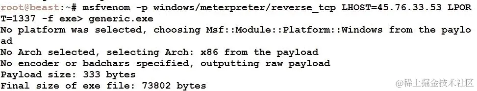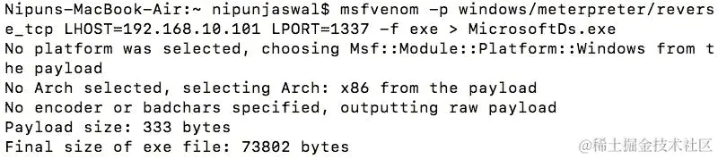 在前面的章节中,我们看到了如何使用 Metasploit 控制各种系统。然而,我们没有考虑到大多数操作系统上都存在防病毒解决方案这一重要问题。让我们创建一个类型为windows/meterpreter/reverse_tcp的后门可执行文件,如下所示: