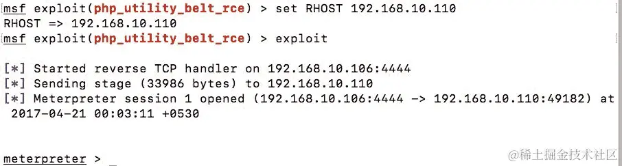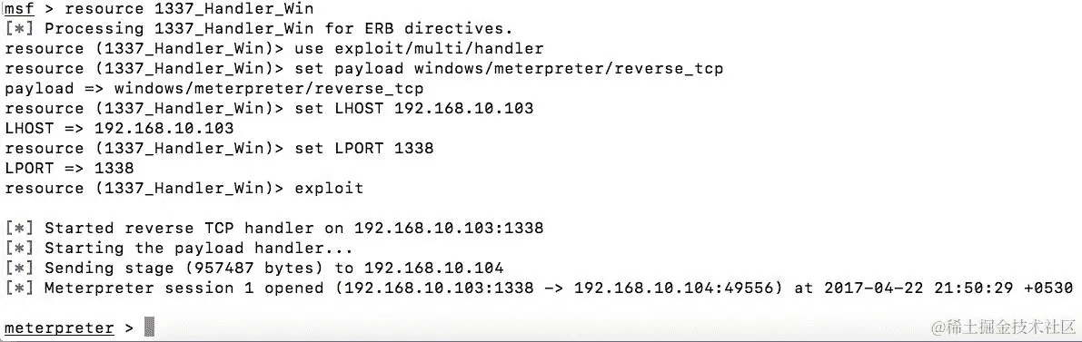 我们只是用multiscript替换了multi_console_command,并更新了我们的后渗透脚本的路径,如前面的截图所示。让我们看看运行exploit脚本时会发生什么: