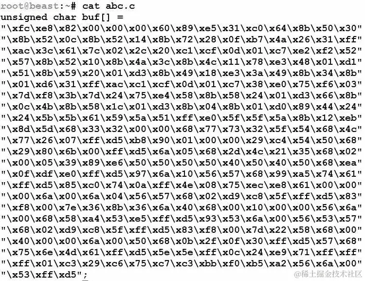 让我们使用新生成的 shellcode 编写一个程序,将生成一个可执行文件,如下所示: