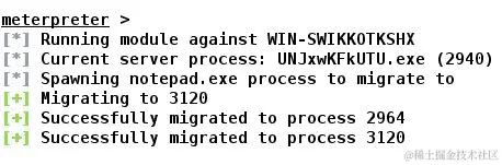 我们成功迁移到了 notepad.exe 进程。但是,如果有多个notepad.exe实例,进程迁移也可能跳过其他进程。