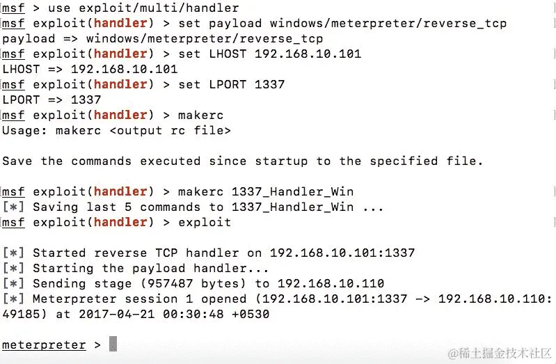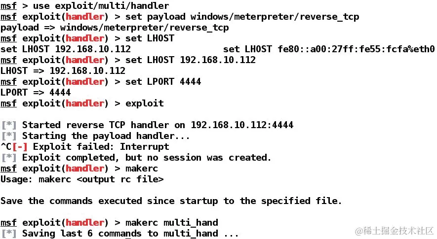 我们可以看到在前面的截图中,我们通过设置相关负载和选项(如LHOST和LPORT)启动了一个利用处理程序模块。发出makerc命令将以系统化的方式保存所有这些命令到我们选择的文件中,本例中为multi_hand。我们可以看到makerc成功地将最后六个命令保存到multi_hand资源文件中。