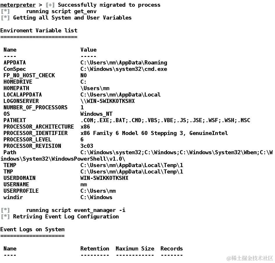 我们可以清楚地看到,在访问目标后,checkvm模块被执行,随后是migrate、get_env和event_manager命令,如下截屏所示: