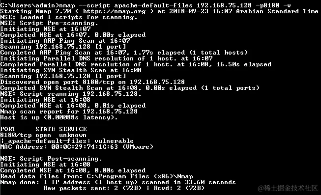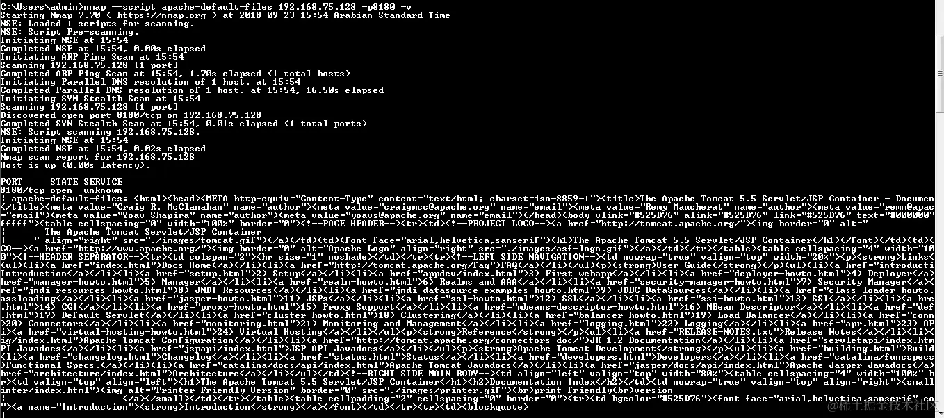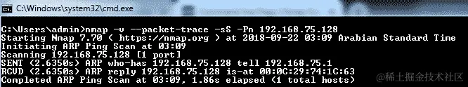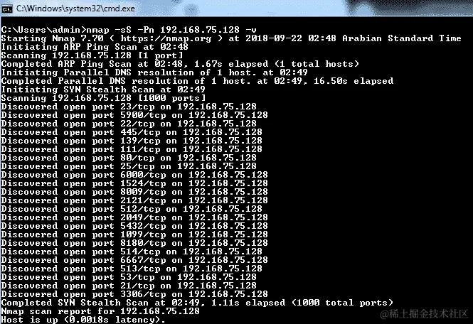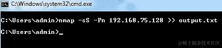 以下命令用于在 IP 地址192.168.75.128上运行 SYN 扫描,并将显示的输出存储到output.txt文件中。由于命令提示符在相同的文件夹中运行,因此可以在C:\Users\admin文件夹中找到此文件。此外,您可以通过在双引号中提及文件的绝对路径来将此文件存储在任何位置: