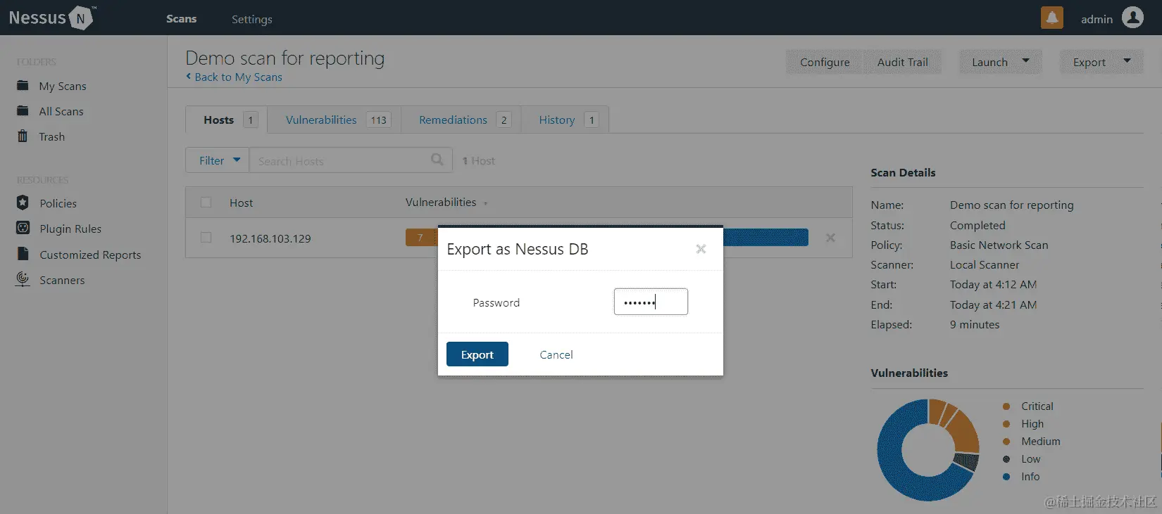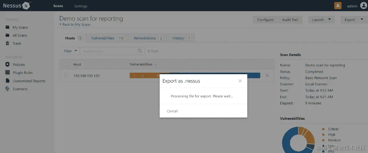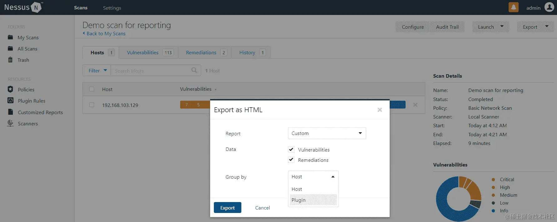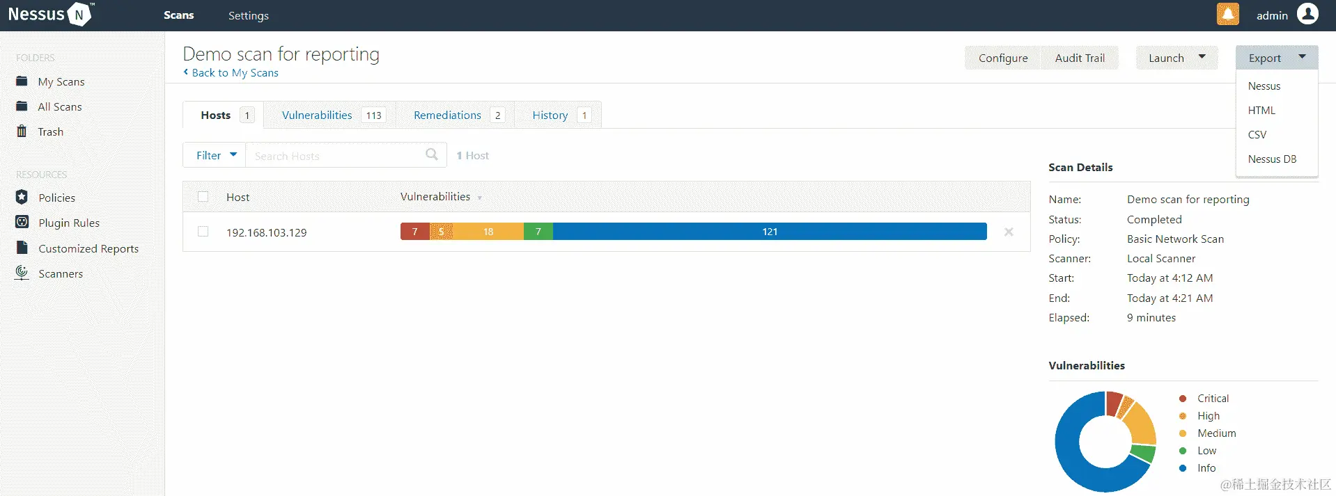 Nessus 更多地是一个面向企业的工具。报告更全面,用户友好。Nessus 提供基于文档和结构的报告。可以通过在扫描结果页面右上角的“导出”下拉菜单中选择所需的格式来导出这些报告: