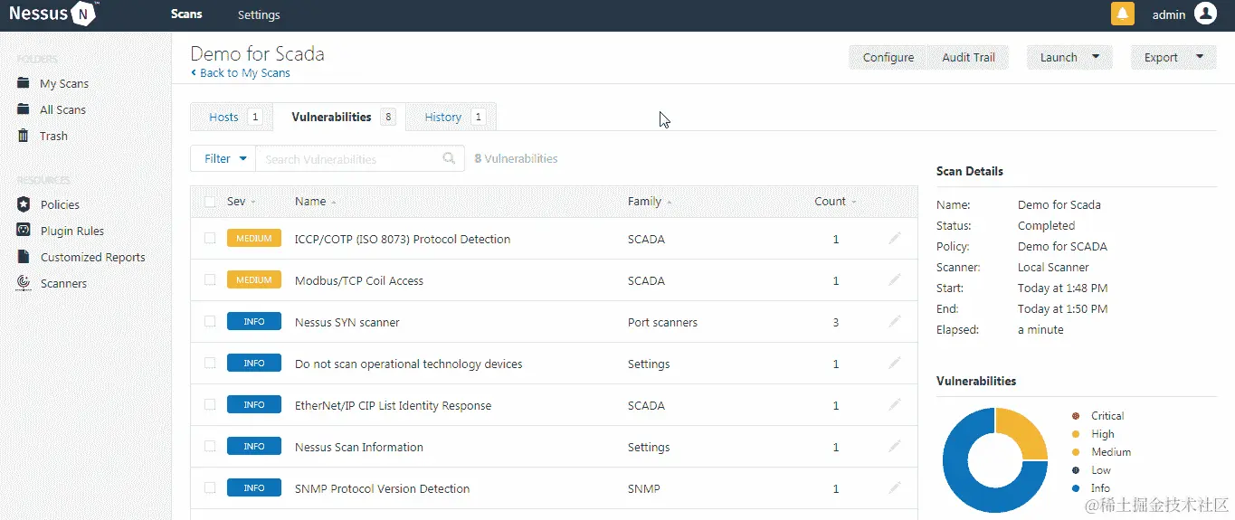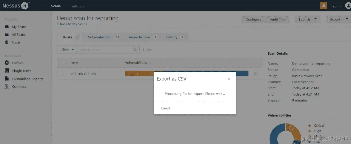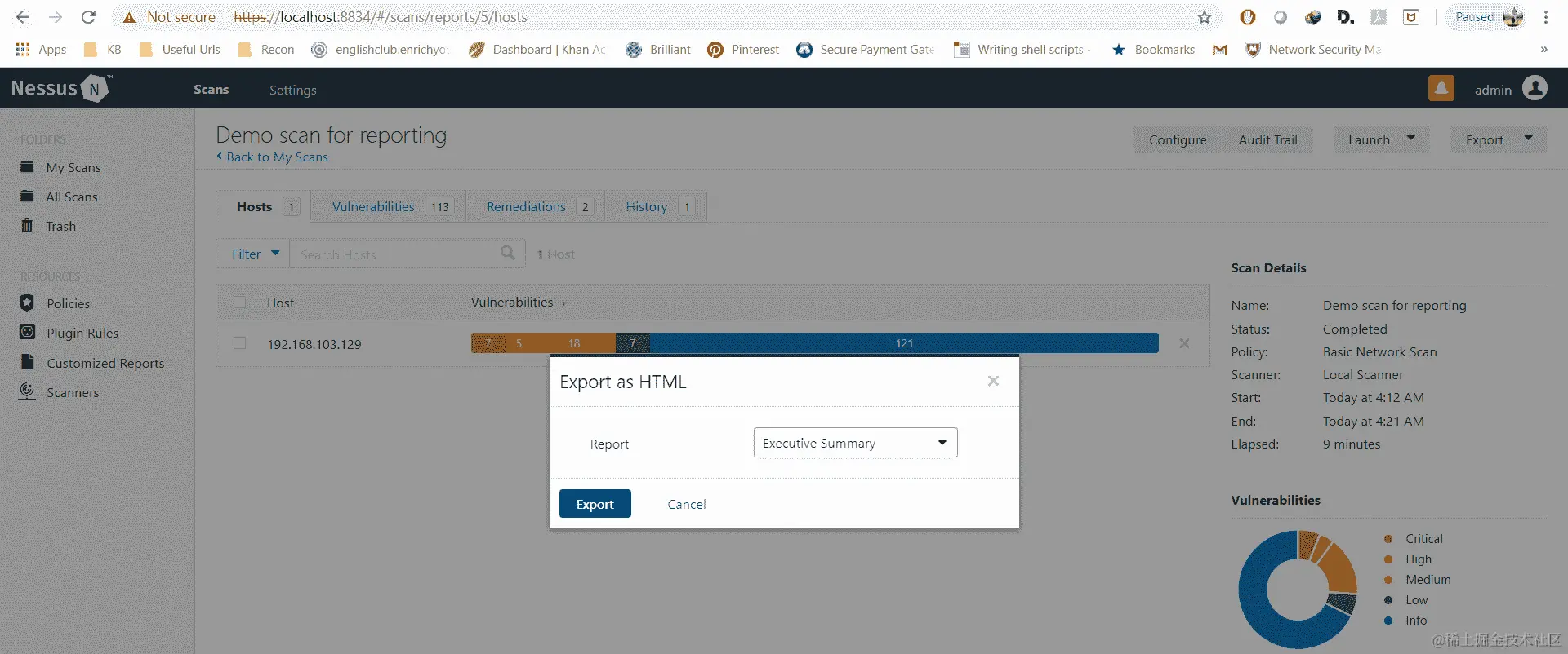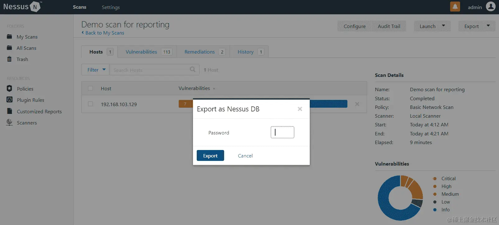 Nessus 更多地是一个面向企业的工具。报告更全面,用户友好。Nessus 提供基于文档和结构的报告。可以通过在扫描结果页面右上角的“导出”下拉菜单中选择所需的格式来导出这些报告: