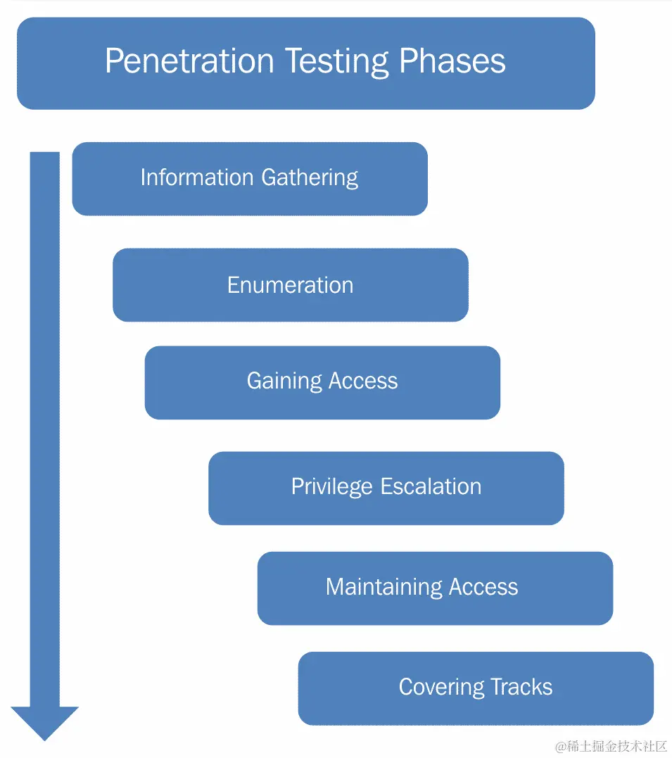 渗透测试执行标准(PTES)是由渗透测试行业中最聪明的头脑和权威专家创建的。它包括渗透测试的七个阶段,并可用于对任何环境进行有效的渗透测试。有关方法的详细信息可以在以下网址找到:www.pentest-standard.org/index.php/Main_Page.