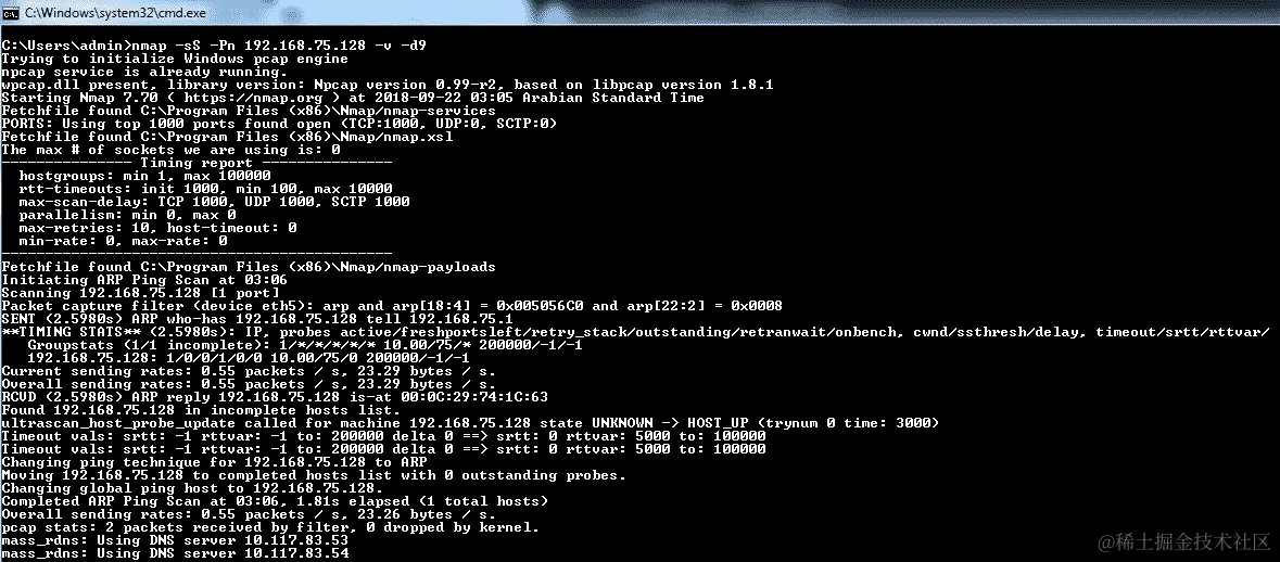 -d来启用此选项。此外,还可以通过在详细信息语法后附加-d9来设置要启用的调试级别,范围为 1 至 9。这是最高级别的调试,提供有关正在执行的端口扫描的大量技术数据: