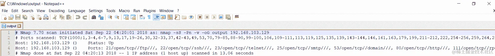 -oG):此格式允许用户对生成的输出执行简单的操作,例如grep,awk,cut和diff。该格式遵循为每个主机创建单行输出的结构,并带有适当的分隔符,以便用户可以使用操作系统中的简单现有工具来分隔和分析结果。Notepad++实用程序就是这样一个例子,它允许基于分隔符的分隔,可以用于创建更有意义的报告。 -