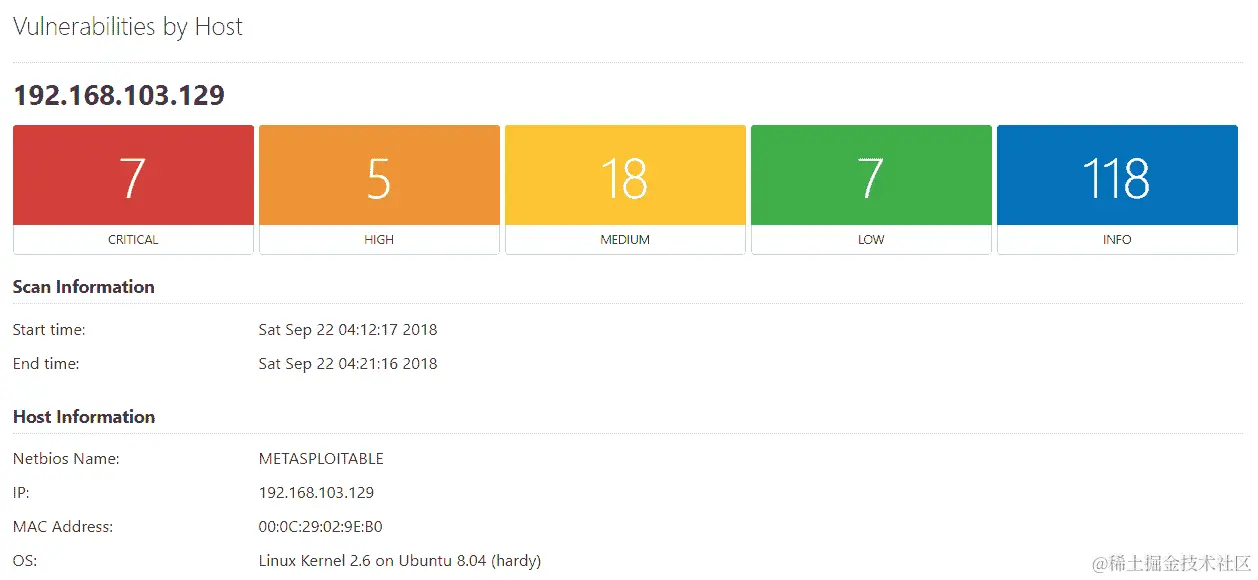 - 按主机的漏洞:此部分包括按主机的实际漏洞。这遵循报告每个主机的所有漏洞,然后转移到下一个主机的格式。这进一步从每个主机的漏洞数量和风险评级的简单摘要开始。这包括扫描信息,如开始时间和结束时间,以及主机信息: