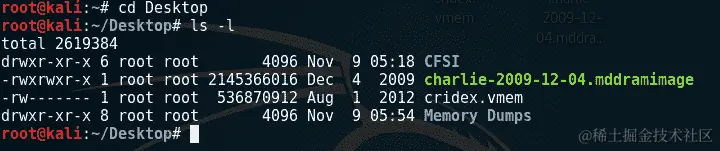 我们还可以查看桌面的内容,以确保cridex.vmem文件存在,方法是输入ls -l: