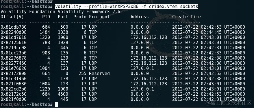 sockets插件可用于提供额外的连接信息监听套接字。尽管 UDP 和 TCP 是以下截图中输出的唯一协议,但sockets命令支持所有协议: