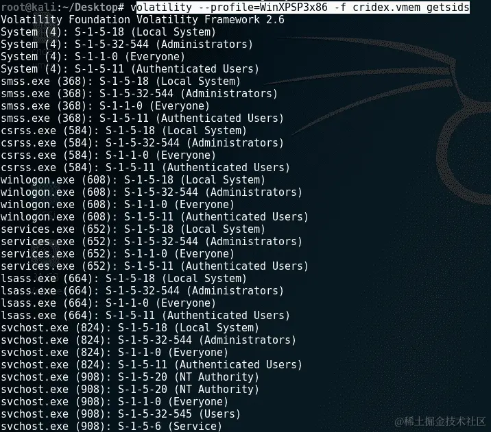 所有用户还可以通过安全标识符(SID)得到唯一标识。getsids命令按照进程启动的顺序有四个非常有用的项目(参考pslist和pstree命令的截图)。