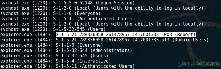 向下滚动getsids输出,我们可以看到一个名为Robert的用户,其 SID 为S-1-5-21-79336058(非管理员),已启动或访问explorer.exe,PID 为1484: