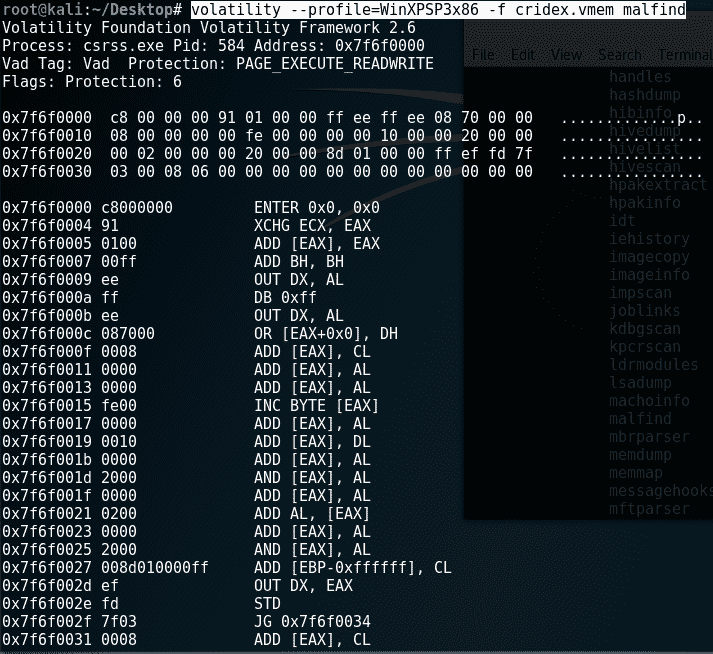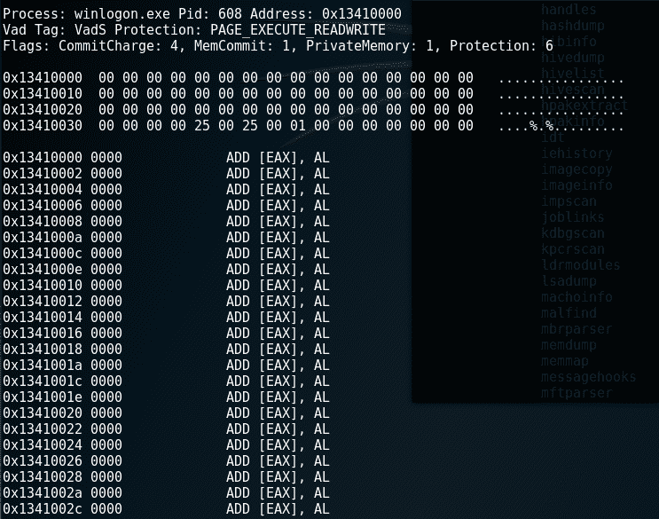 以下截图显示了 Volatility Framework 中许多插件的片段: