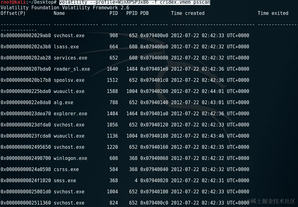 查看运行进程列表后,我们通过输入以下命令运行psscan命令: