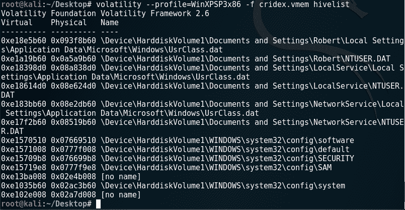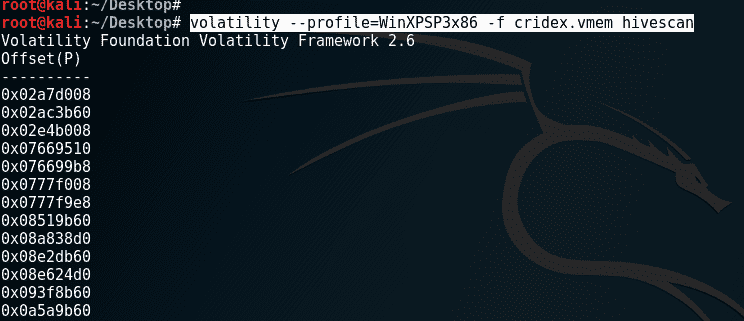 正如我们将很快看到的,Volatility 框架中的所有插件都是通过终端使用的。为了使访问图像文件更加方便,不必指定图像的冗长路径,我们已将cridex.vmem图像移动到桌面: