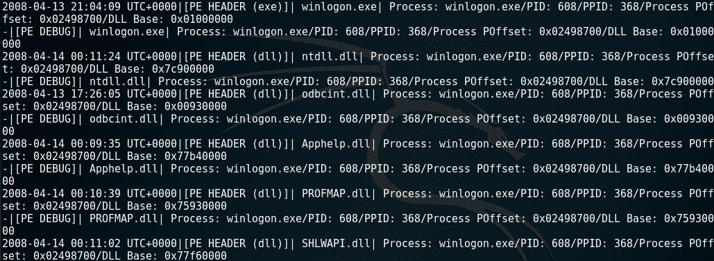 PID 标识进程,PPID 标识进程的父进程。查看pslist输出,我们可以看到winlogon.exe进程的PID为608,PPID为368。services.exe和lsass.exe进程的 PPID(在winlogon.exe进程之后)都是608,表明winlogon.exe实际上是services.exe和lsass.exe的 PPID。