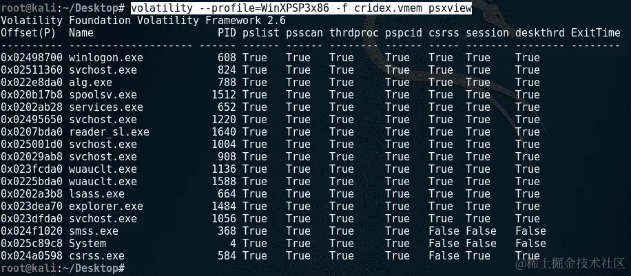 psscan命令显示了可以被恶意软件使用的非活动甚至隐藏的进程,如 rootkits,这些进程以逃避用户和杀毒程序的发现而闻名。