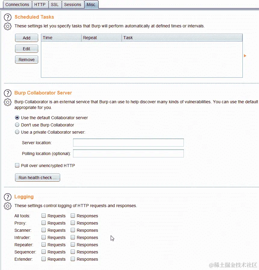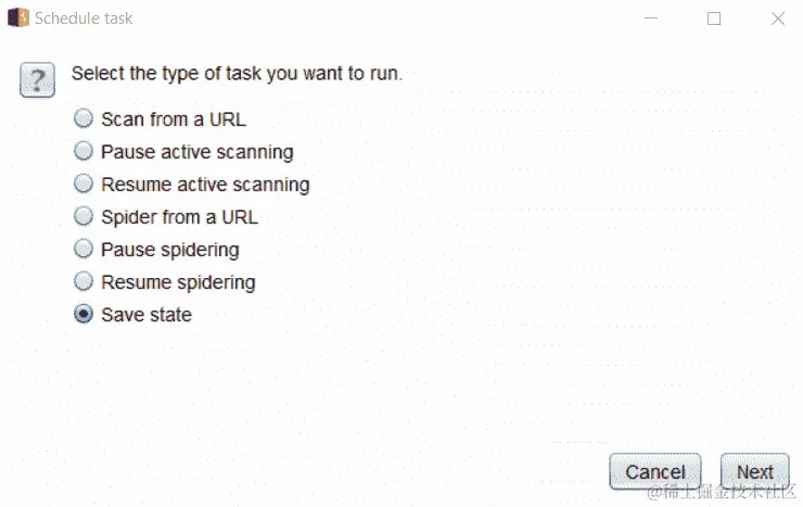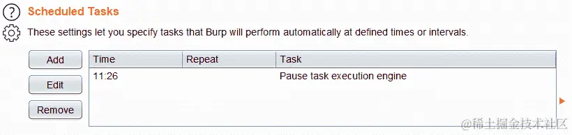安排保存状态操作:Burp 有一个任务调度程序,可以用于某些任务,例如恢复和暂停扫描和爬行。您可以从项目选项|其他|计划任务中打开任务调度程序。