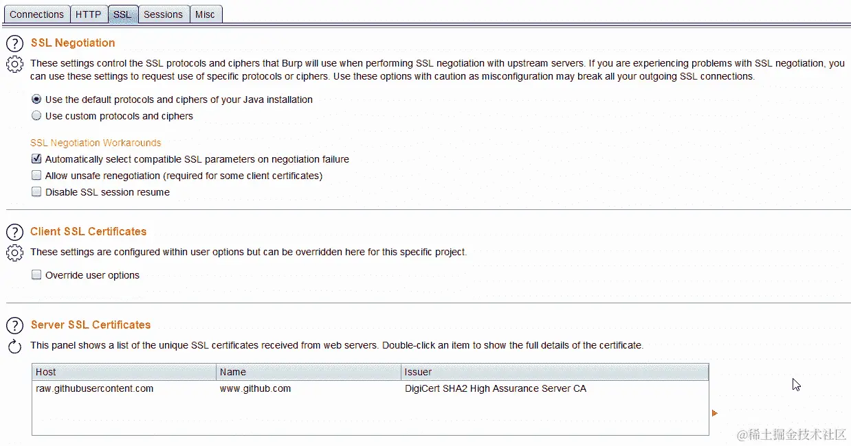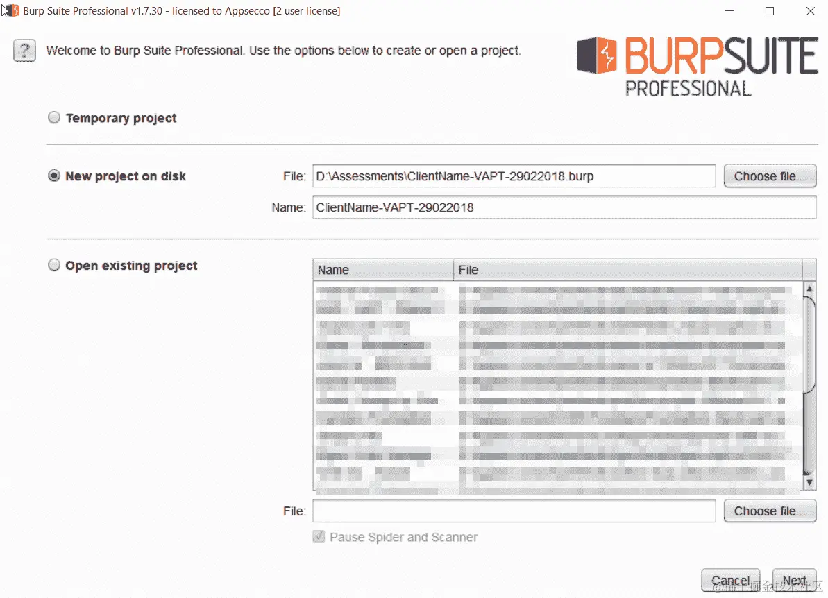 磁盘上的新项目:对于良好执行的渗透测试,能够记录和检索作为测试一部分的请求和响应的日志非常重要。此选项允许您在磁盘上创建一个文件,该文件将存储在开始测试时在 Burp 中设置的所有配置数据、请求和响应以及代理信息。可以提供描述性名称以便将来加载此文件。一个良好的经验法则是创建一个提供有关项目本身信息的名称。ClientName-TypeOfTest-DDMMYYYY是一个很好的起点。