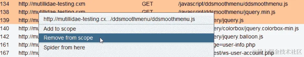 就像我们可以在 Burp 中添加范围项目一样,我们也可以添加需要明确设置为超出范围的项目。与范围内项目一样,这可以通过两种方法添加。第一种是通过右键单击上下文菜单从代理|历史记录选项卡添加:
